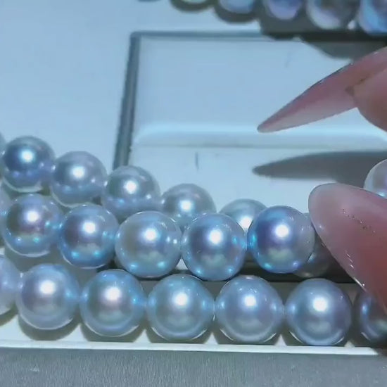 This refined necklace features Japanese Akoya seawater pearls measuring 8-8.5 mm. The rare mahogany tone is enhanced by soft grey hues and a subtle silver-blue sheen, creating a cool, elegant look.