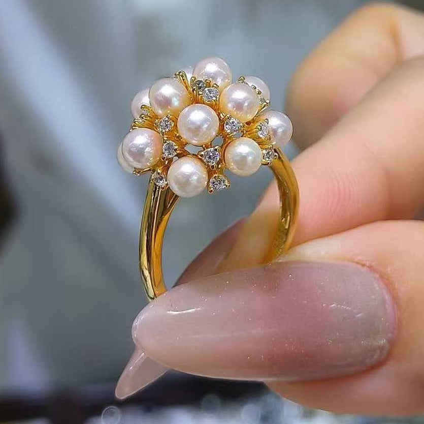 A delicate bouquet ring featuring 14 natural Japanese Akoya seawater pearls, offering a soft and graceful look on the skin.