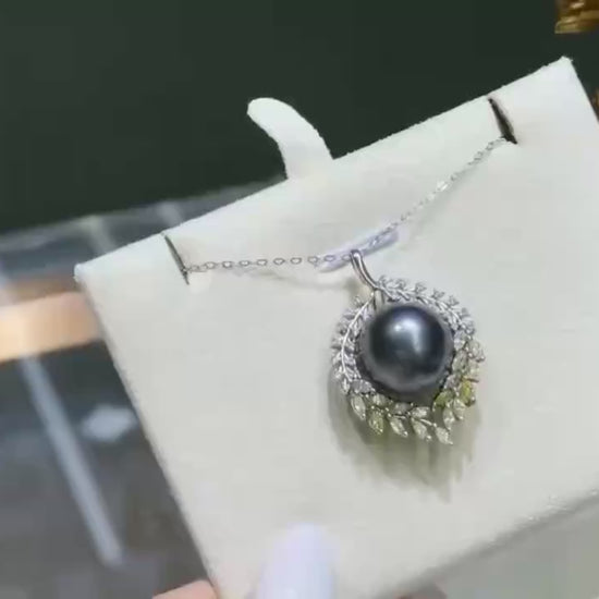 This vintage-inspired pendant showcases a 12–13mm round Tahitian black pearl, prized for its deep, mysterious color and radiant luster. The smooth, flawless surface is elegantly framed by a vine-inspired design, highlighting the pearl’s natural beauty and sophistication.