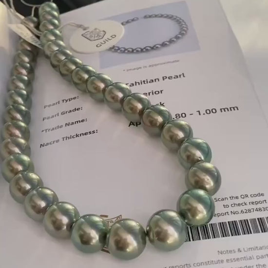 This exceptional necklace features natural Tahitian saltwater pearls measuring 12-13.7 mm. Each pearl is perfectly round, displaying a rare peacock green tone with an aurora-like overtone and a deep, luminous luster.