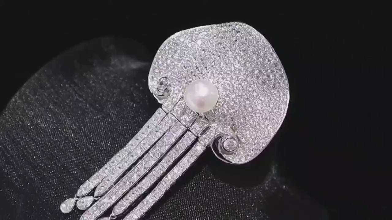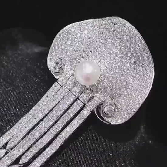 这款复古风格的水母流苏胸针灵感源自英国皇室设计,是一件引人注目的饰品。它采用925纯银打造,并镀以厚厚的18K金,饰有闪耀的5A级立方氧化锆和一颗天然的10毫米淡水珠,尽显奢华优雅。