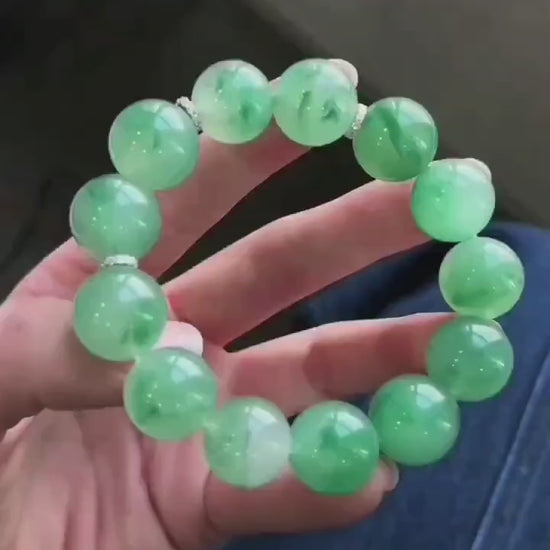 这款天然非洲翡翠手链以其大胆的尺寸和精湛的工艺展现出自信的气质。每颗硕大的翡翠珠子都晶莹剔透,纹理柔和流畅,呈现出明亮均匀的苹果绿色。精选的翡翠不含黑点和可见杂质,表面光滑抛光,并带有高品质翡翠特有的天然清凉触感。