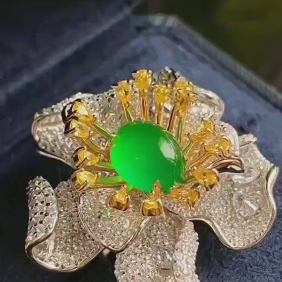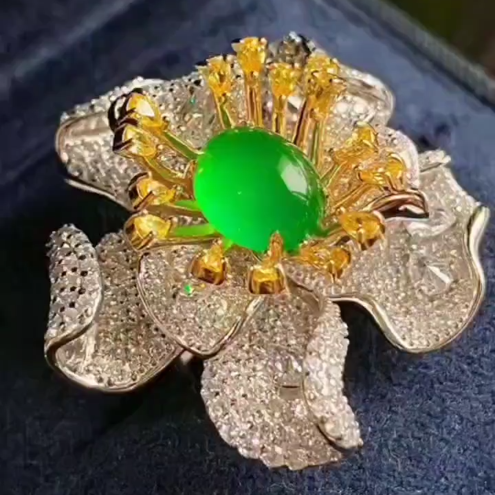 这款艺术戒指以精湛的手工技艺打造而成,以栩栩如生的层叠花瓣,呈现出令人惊艳的花卉设计。戒指通体采用925纯银镀18K黄金和白金,每一处细节都由工匠精心镶嵌闪耀钻石,尽显精湛工艺和艺术造诣。