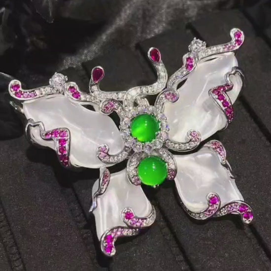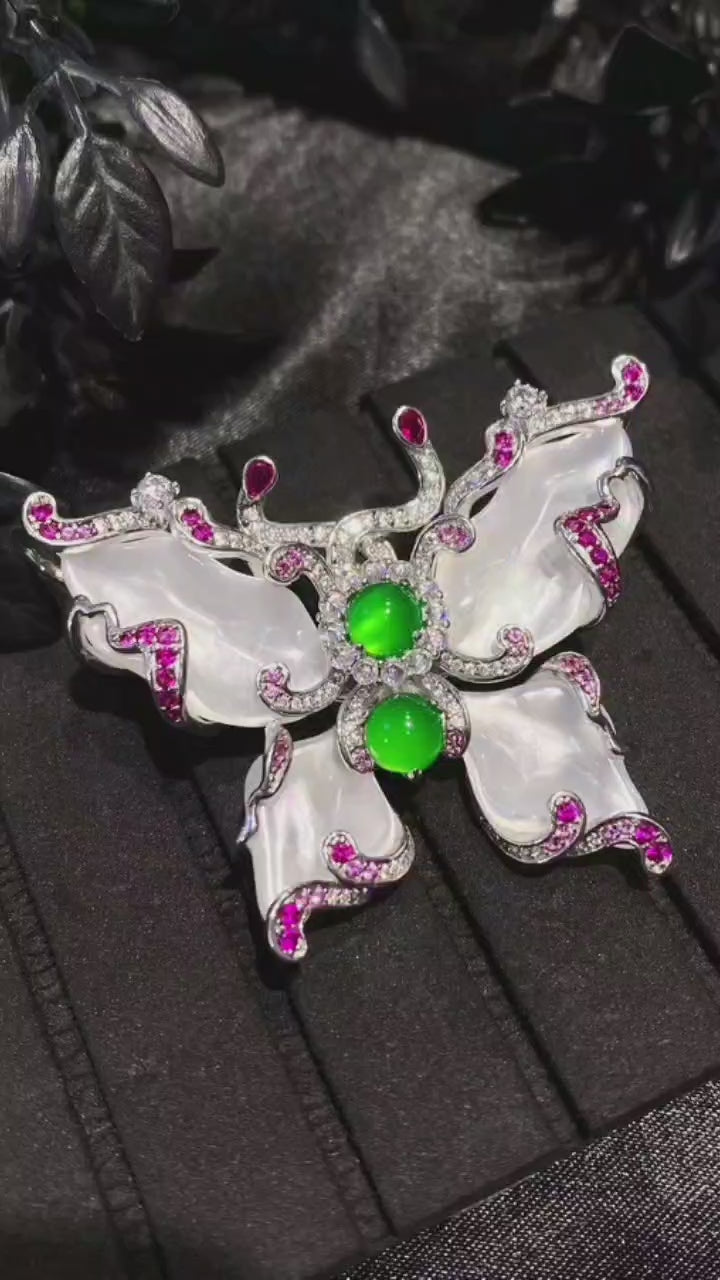 这款永恒经典的艺术珠宝,以蝴蝶为造型,中心镶嵌一颗天然翠绿色椭圆形宝石,周围环绕着闪耀的人造红宝石,并以纹理丰富的白色珍珠母贝为衬托。从珍珠母贝的表面处理到宝石的镶嵌位置,每一个细节都经过精心手工打造。