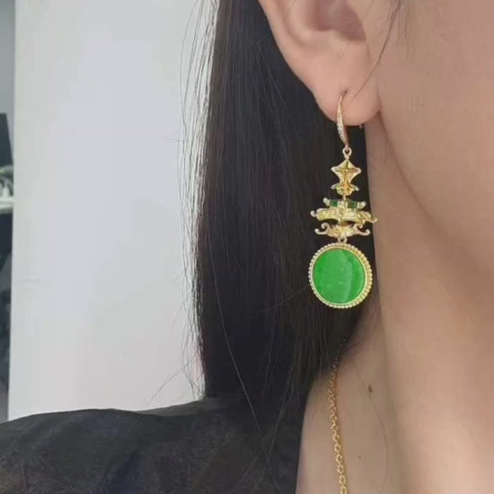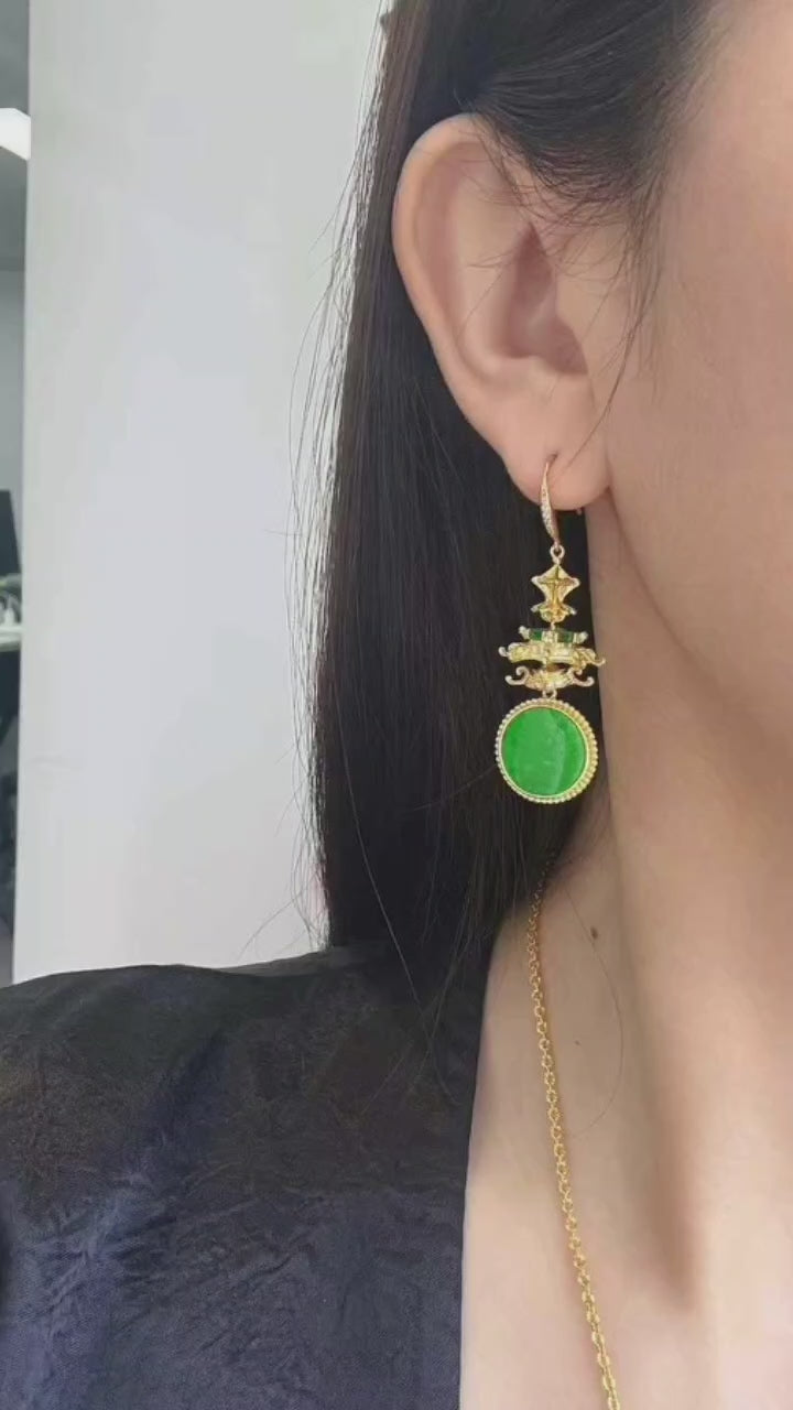 材质:天然A级翡翠,925纯银镀18K金设计:宝塔造型耳环,完美无瑕的翡翠