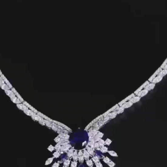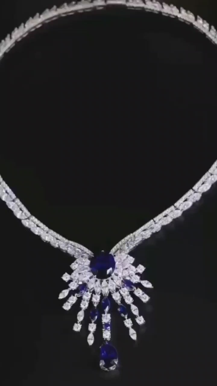 这款项链采用经典的烟花造型设计,配有可拆卸吊坠,也可作为胸针佩戴,风格百变。项链镶嵌高品质钻石,其璀璨度和硬度可媲美天然宝石,并以手工镶嵌于镀18K白金的纯银底座上。大克拉蓝宝石镶嵌于精雕细琢的底座之上,尽显奢华高端的珠宝魅力。