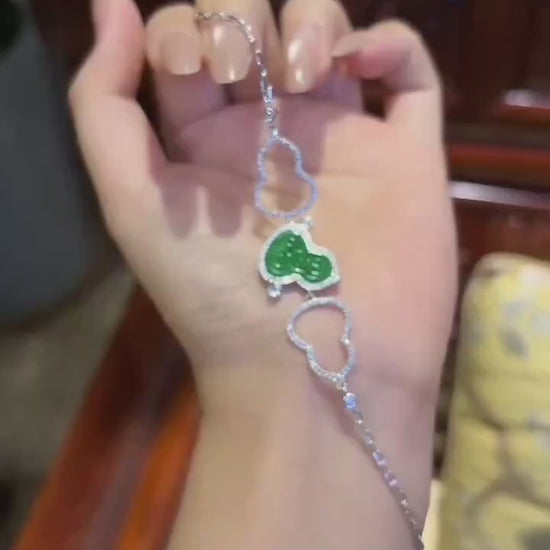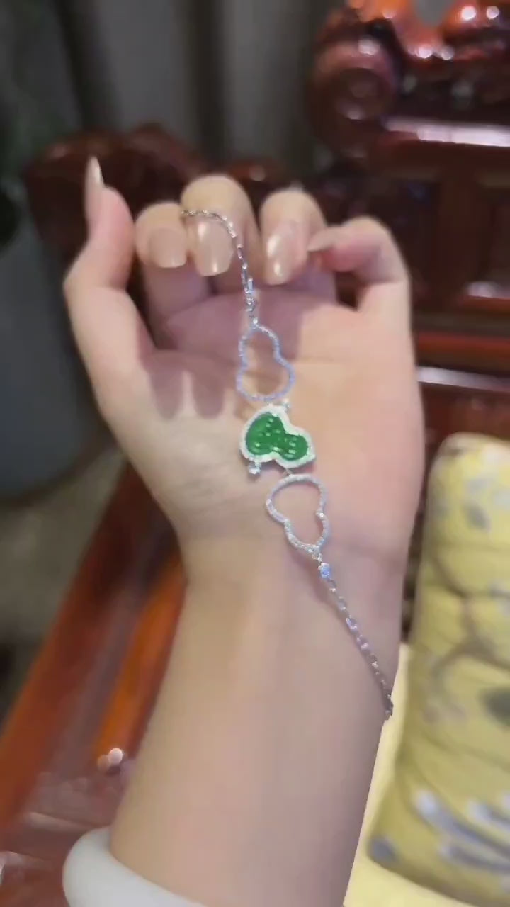 天然A级缅甸翡翠葫芦形手镯,925纯银镀白金,镶嵌厚重翡翠。