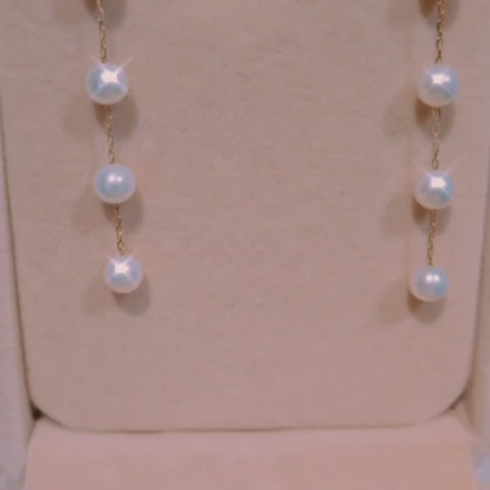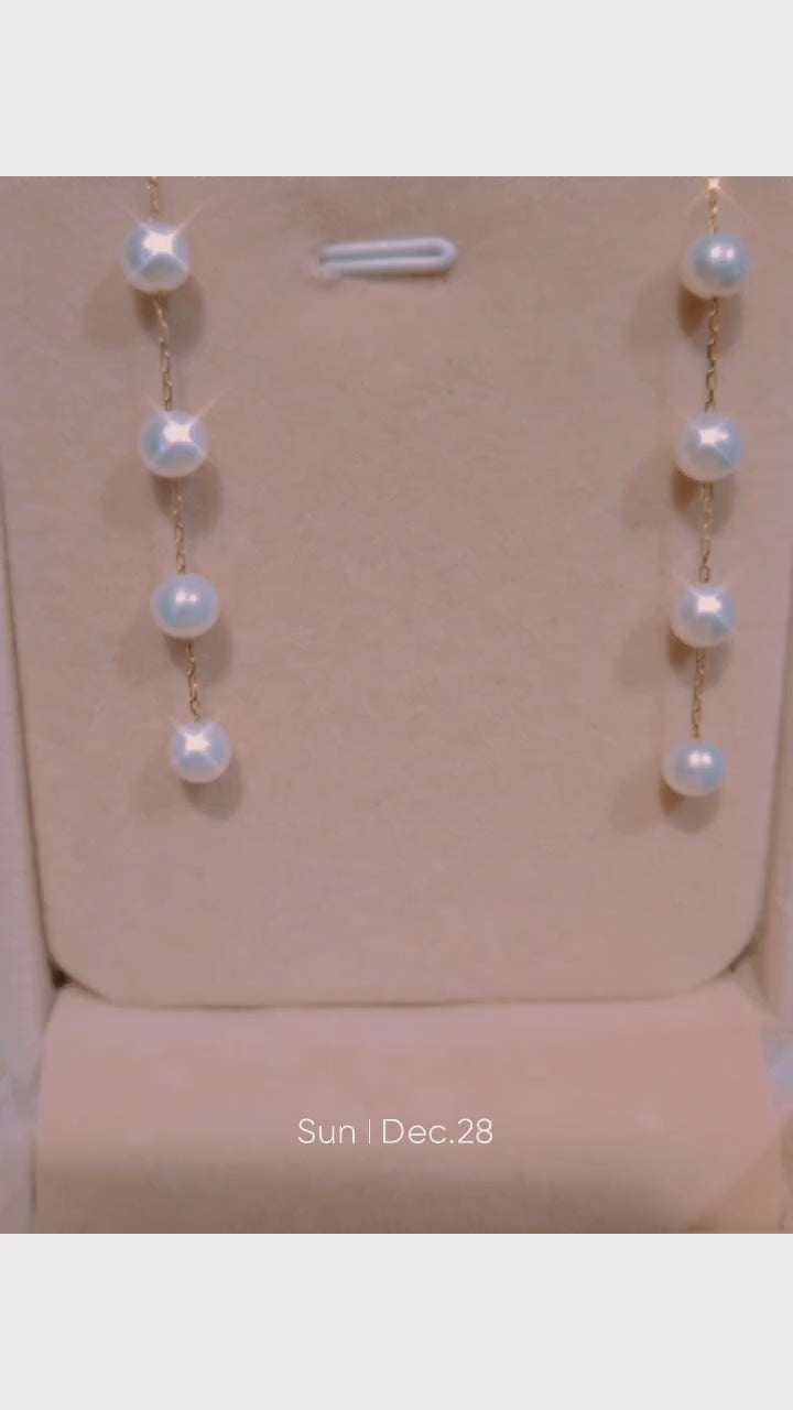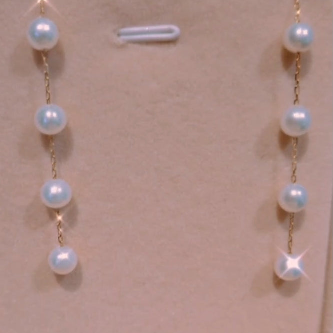 这款精美耳环镶嵌4-5毫米天然淡水极光珍珠,珍珠圆润饱满,散发着璀璨夺目的光泽。耳环采用18K金打造,并搭配10颗较小的极光珍珠,巧妙地排列在金链上,营造出清新优雅的气质。
