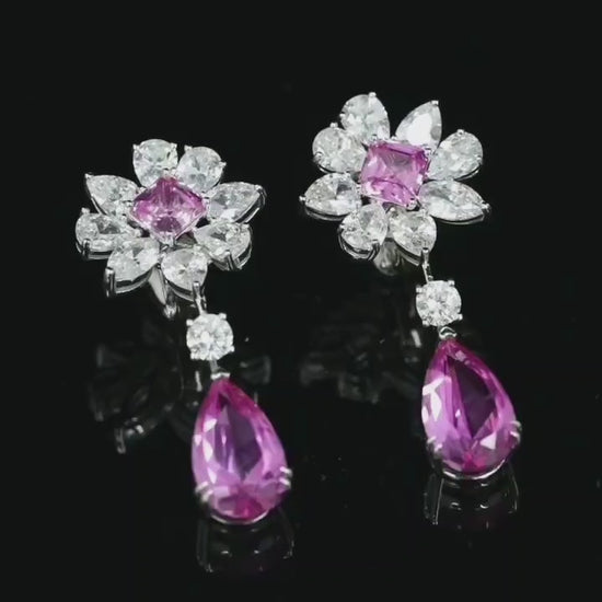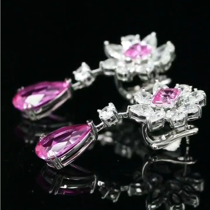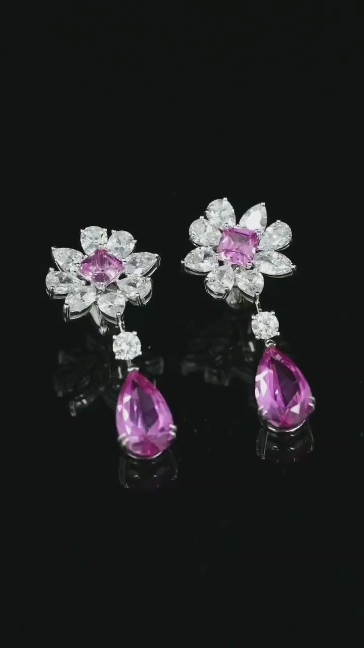 这款精美耳环以精致的花朵造型镶嵌人造粉色蓝宝石,并搭配闪耀的高科技钻石,呈现出璀璨夺目的效果。耳环主体采用925纯银打造,并镀以厚厚的18K白金,每颗宝石均由技艺精湛的工匠手工镶嵌。