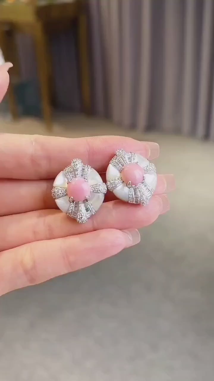 这款精美耳环以一颗2克拉天然粉色珍珠母贝为主石,搭配白色珍珠母贝底座,营造出柔和优雅的对比效果。耳环采用925纯银打造,并镀以厚厚的18K白金,周围镶嵌闪耀钻石,更添璀璨光芒。