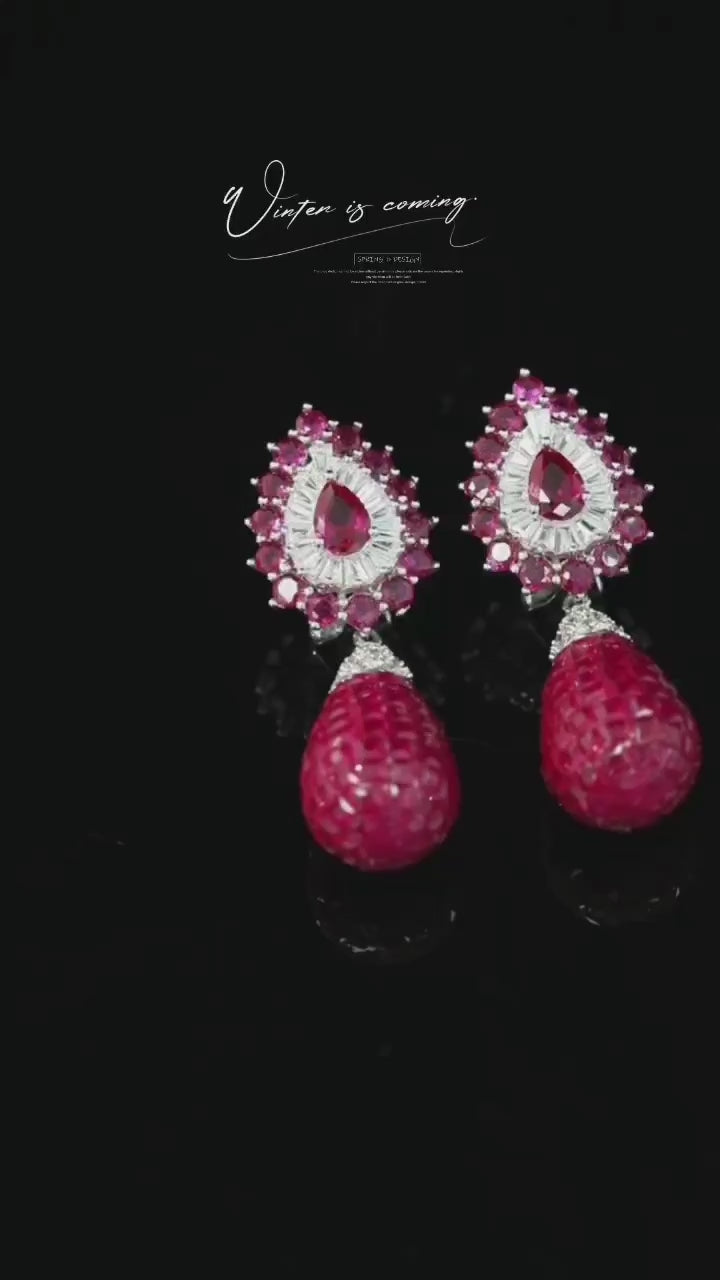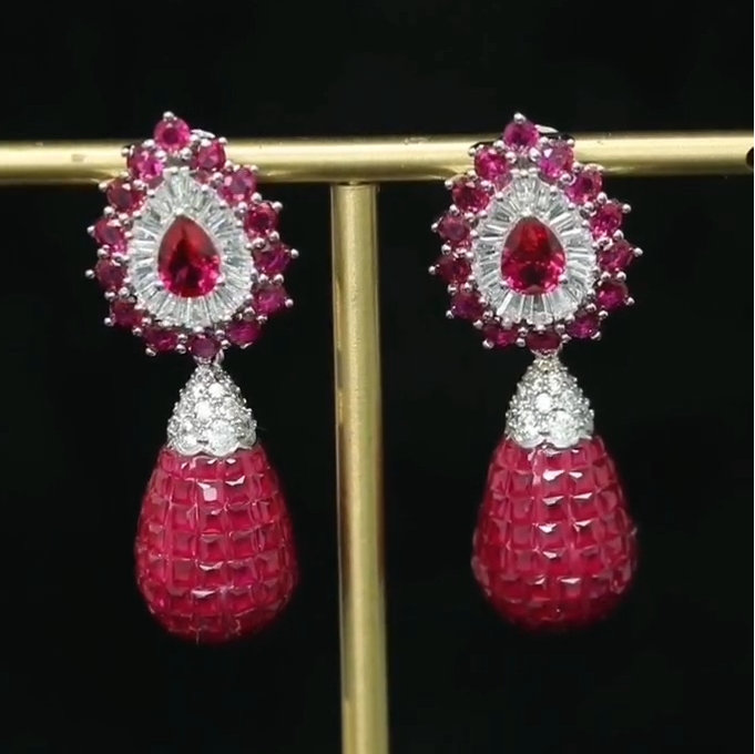 材质:人造红宝石、高科技钻石、925纯银镀18K白金设计:灵感源自舞厅的耳环,手工镶嵌宝石