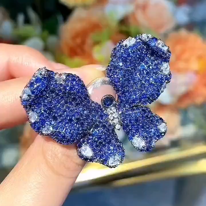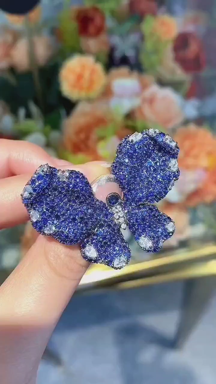 这款经典的艺术珠宝套装以精美的蝴蝶图案为特色,采用925纯银打造,并镀有厚厚的18K金。蝴蝶全身镶嵌实验室培育的蓝宝石,边缘饰以高科技钻石,营造出栩栩如生的立体效果。